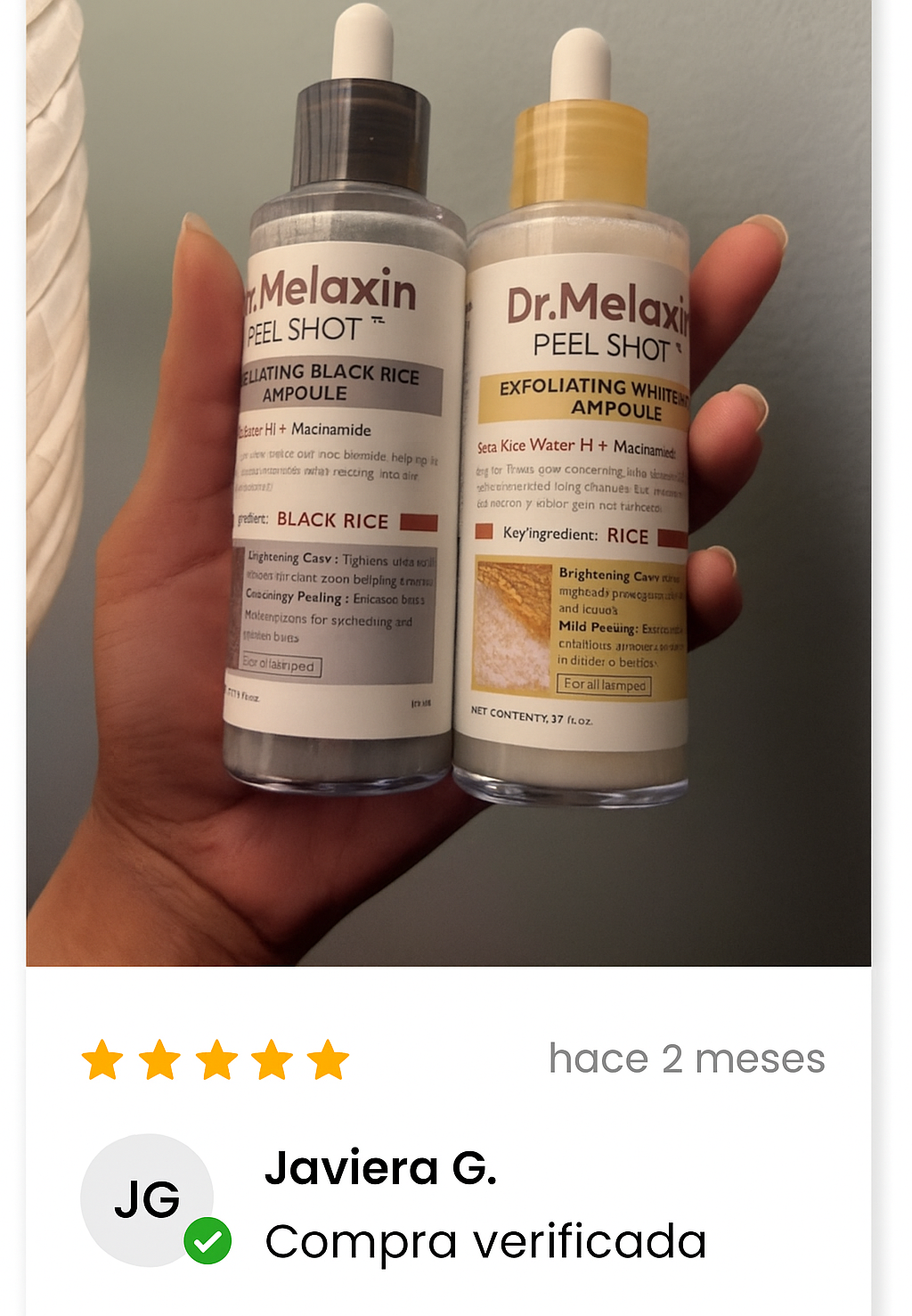 - "Lo uso uno por la noche y el otro por el día y la piel se ve más luminosa."